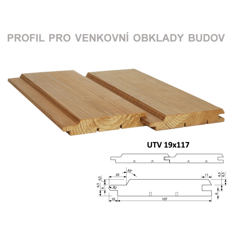 Fasádní palubka UTV 19x117 mm s perem a drážkou je určená pro venkovní použití na obklady fasád, podbití střešních přesahů a dalších stavebních konstrukcí s možností montáže vodorovně či svisle.